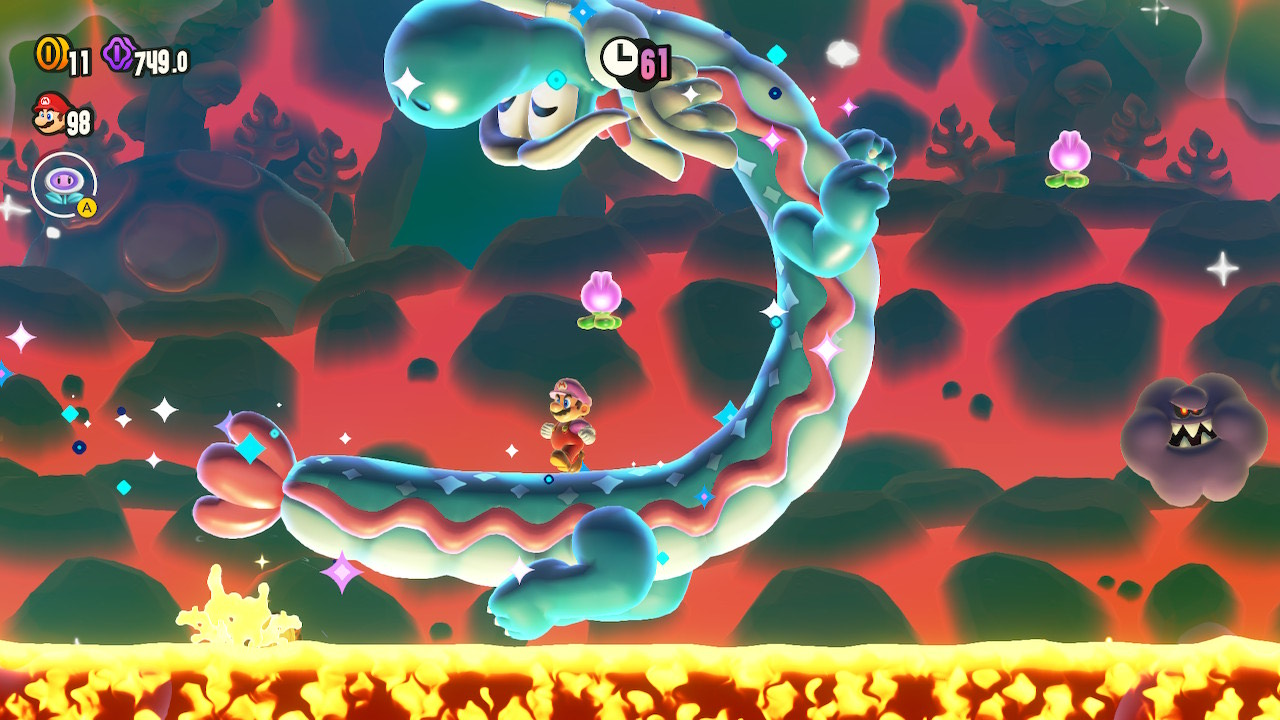 Mario and friends aren’t strangers to dragons, though they’re usually foes rather than adorable friends – like the Ruined Dragon in Super Mario Odyssey. In the Flower Kingdom, however, it seems dragons have gone extinct. The Dragon Boneyard has two fun gimmicks to it: first, you have to ride rolling dragon fossils, both inside them through a small open hole and outside of them, as purple avians fly at you. Challenging in its own right, this level takes a page out of The Neverending Story once you find the Wonder Flower, bringing one of the dragon fossils to life to ride around a dangerous lava field. Thankfully, this dragon is much more friendly than its Ruined cousin.