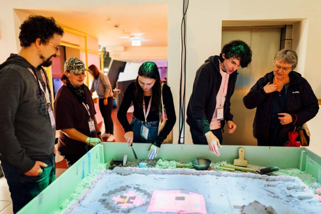 Unter den Installationen fiel mir besonders eine auf, die das Digitale physisch greifbar machte: eine Minecraft-inspirierte Station, an der Besucher*innen mit einem feinen kneteähnlichem Material, das keine Rückstände auf den Fingern hinterließ, eigene Blocklandschaften formten.