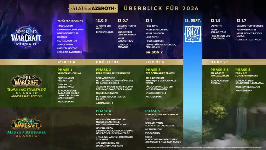 Das Jahr 2026 endet dann mit Patch 12.1.7, der weitere Story-Inhalte, einen eigenständigen Modus abgekoppelt von Retail und entwickelt vom Team hinter Plunderstorm, und eine weitere Ausgabe der Turbulenten Zeitwege bringt. Alles in allem also ein vollgepacktes Jahr für Retail-Fans.