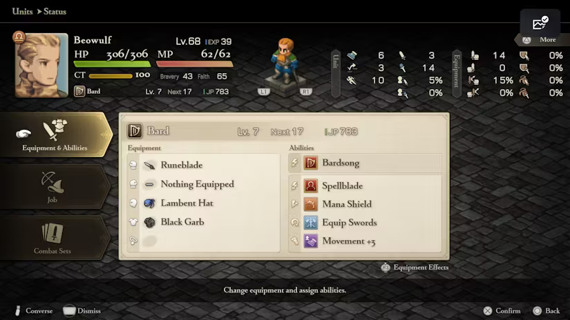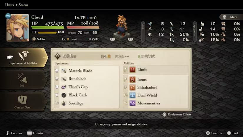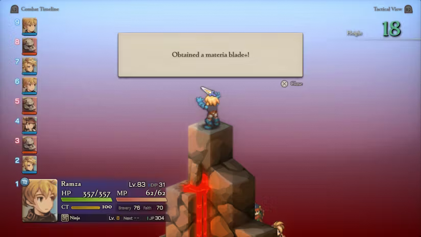 Contrairement au Final Fantasy Tactics original, Cloud possède déjà une Materia Blade, lui permettant d’utiliser ses attaques de Limite. Cependant, il est désormais possible de trouver une Materia Blade+, beaucoup plus puissante.