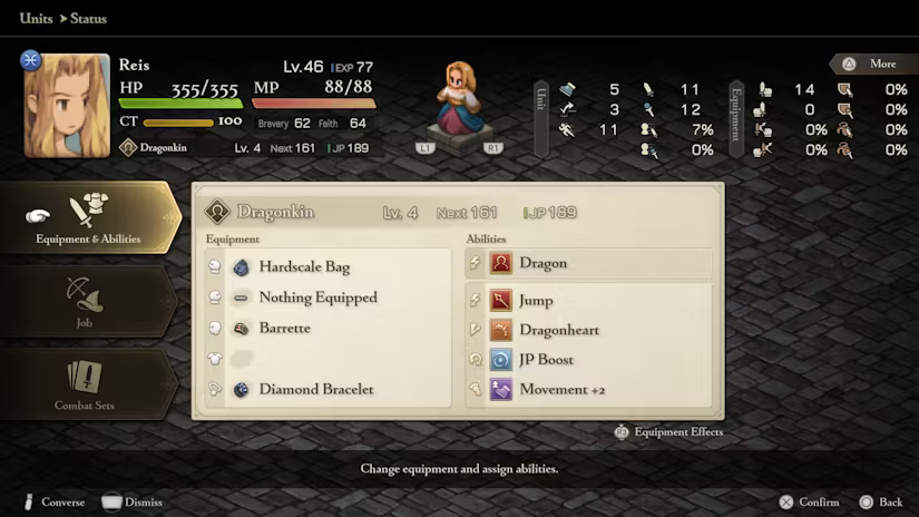 Pour transformer Reis en humaine (et débloquer un personnage encore plus puissant), poursuivez le Chapitre 4 jusqu’à la découverte de la Cité marchande de Sal Ghidos. Rendez-vous ensuite au Château de Zeltennia et lisez les rumeurs. Puis retournez à Sal Ghidos : une scène se déclenchera où une marchande de fleurs demande à Ramza d’acheter une fleur. Dites oui, car cela est nécessaire pour recruter Reis et Cloud.