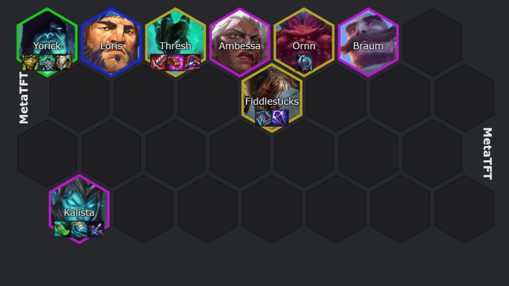 La composition Kalista Îles Obscures excelle en mid-game grâce à Kalista et Thresh, soutenus par des Remparts et Conquérants pour sécuriser la frontline. Capable de snowball rapidement si le début est favorable, elle perd toutefois de son efficacité en late game face aux unités 5 coûts, exigeant un bon timing.