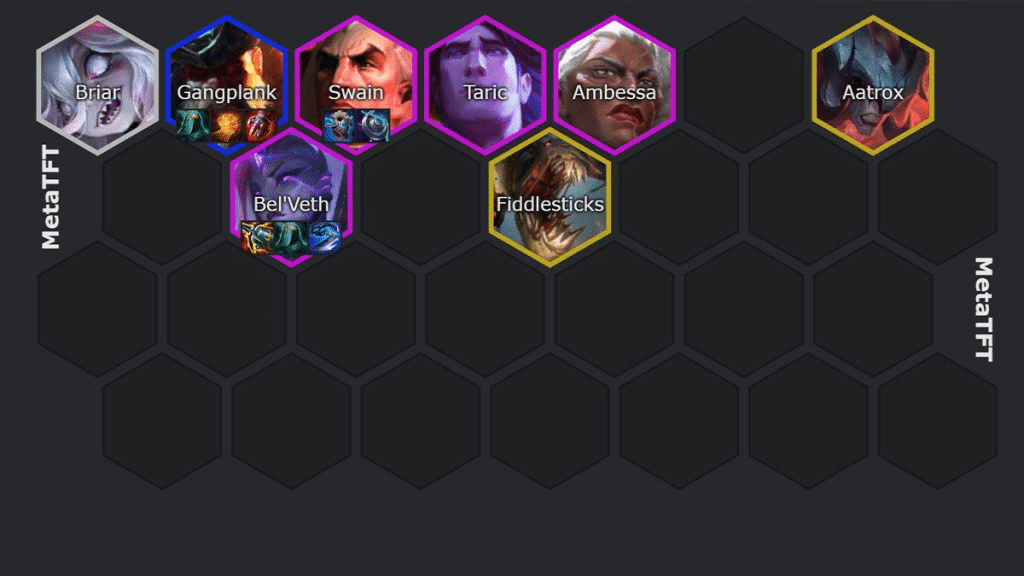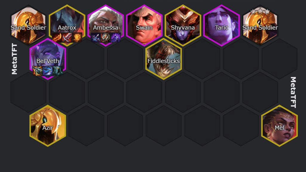 La composition Bel’Veth & Aatrox Bourreau se distingue par son agressivité et sa puissance mid-game. Avec les items adaptés, Bel’Veth devient un carry redoutable tandis qu’Aatrox soutient la pression offensive. Flexible et efficace, cette compo peut maintenir sa domination jusqu’en late game, garantissant top 4 et souvent top 1.