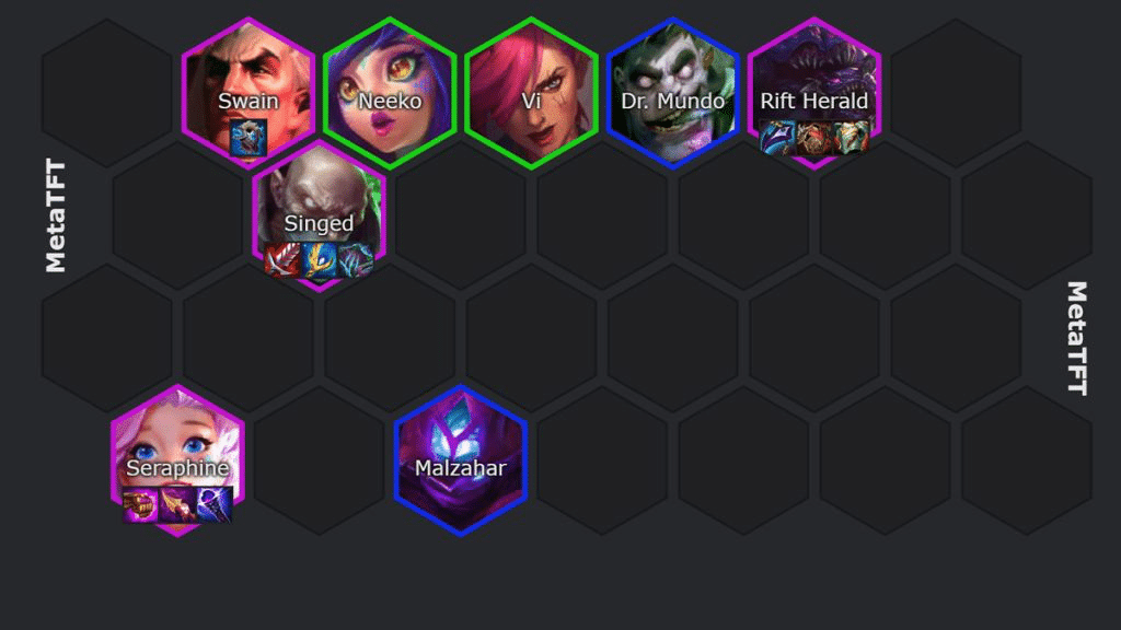 La composition Singed / Seraphine combine un fort sustain et des dégâts polyvalents, avec Singed en carry tank et Seraphine en backline AP. Très puissante au late-game, elle exige un positionnement précis et une frontline solide, tout en optimisant les items AP et les synergies Zaun et Colosse.