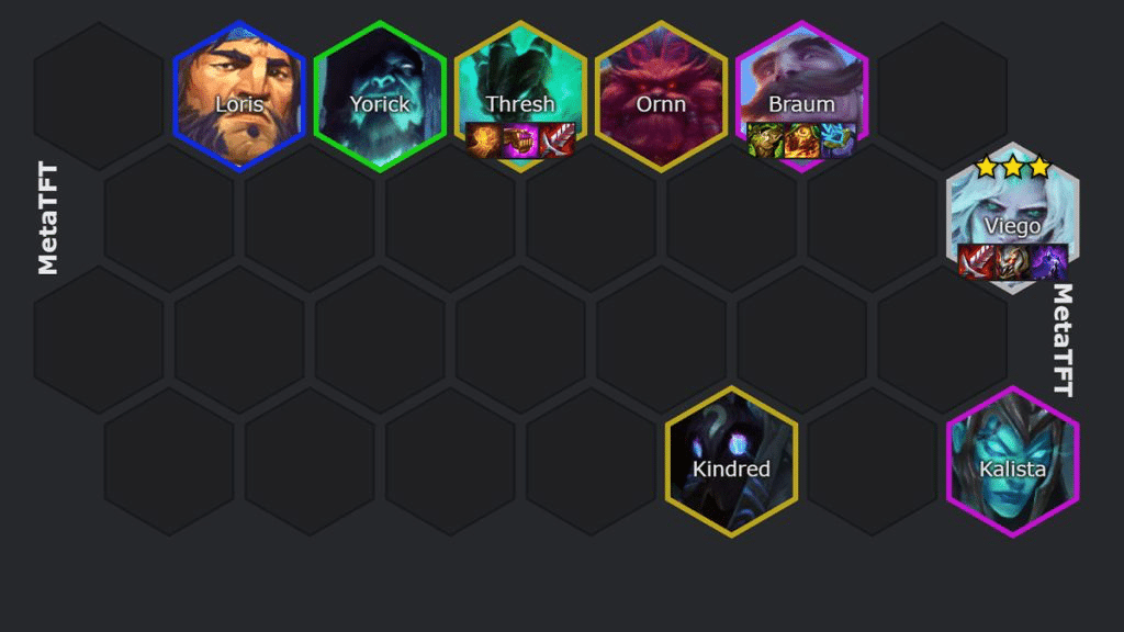 La composition Viego Roi Déchu repose sur un Viego 3 étoiles maximisant le trait Îles Obscures pour infliger des dégâts massifs. Très efficace en mid-late game, elle nécessite un carry bien itemisé et une bonne frontline avec Kalista, Thresh et Remparts pour encaisser et sécuriser les tops boards.