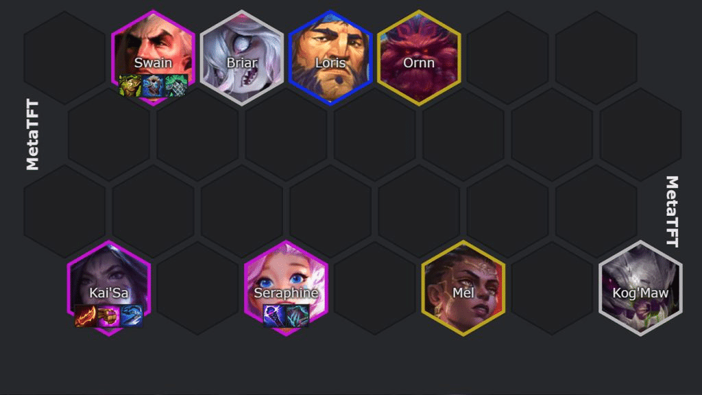 La composition Kai’Sa Flex mise sur Kai’Sa comme carry AP flexible, soutenue par une frontline solide avec Swain, Briar et Loris. Elle exploite les traits Néant et Tireur d’élite, permet diverses synergies et optimise les augmentations comme Bronze for Life ou Stand United, garantissant un impact fort en mid-late game.