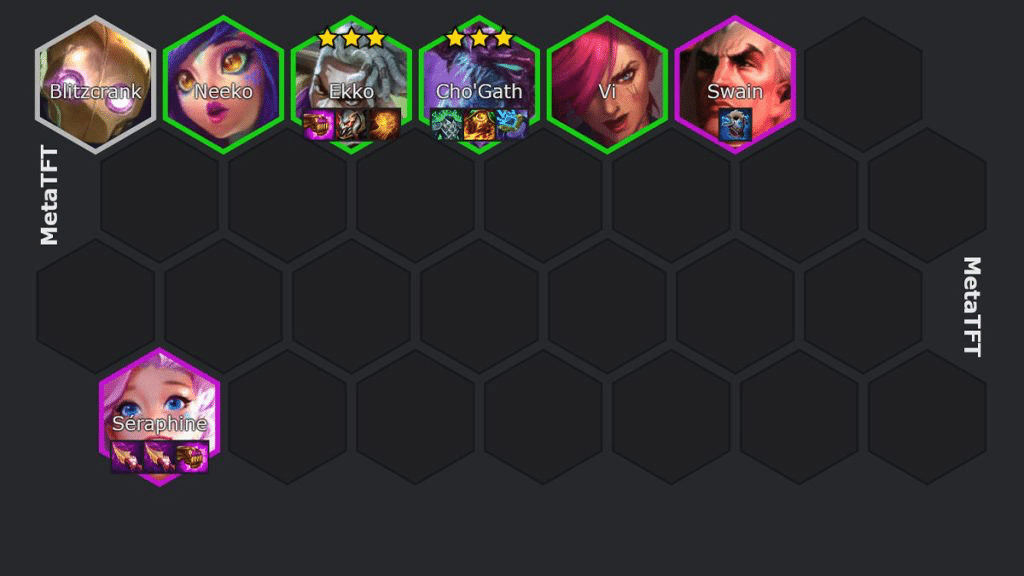 La compo Ekko Cho’Gath Reroll repose sur Ekko carry AP et Cho’Gath tank. Jouée en slow roll, elle exploite les traits Zaun, Perturbateur et Colosse. L’objectif est d’atteindre Ekko et Cho’Gath 3 étoiles tout en sécurisant l’économie, puis compléter le board avec Swain, Seraphine et unités flex pour dominer mid-late game.