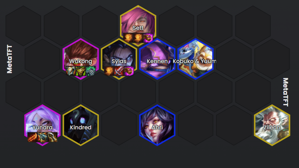 La compo Sett Ionia exploite les synergies Ionia et Bagarreur pour stabiliser le board dès l’early game. Jhin et Yunara sont vos carries principaux, tandis que Sett, Wukong et Leona forment la frontline. Monter au niveau 8 et débloquer Sylas permet de maximiser l’efficacité et viser le top 1.