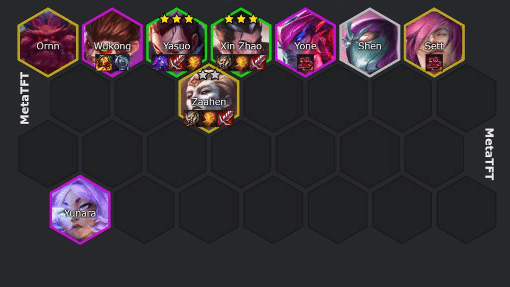 La compo Zaahen s’appuie sur Xin Zhao et Yasuo 3 étoiles pour activer Ionia, avec Zaahen comme carry final. Mid et late game reposent sur un slow roll et une économie stable pour débloquer tous les champions et synergies, incluant Wukong, Yone et Sett.