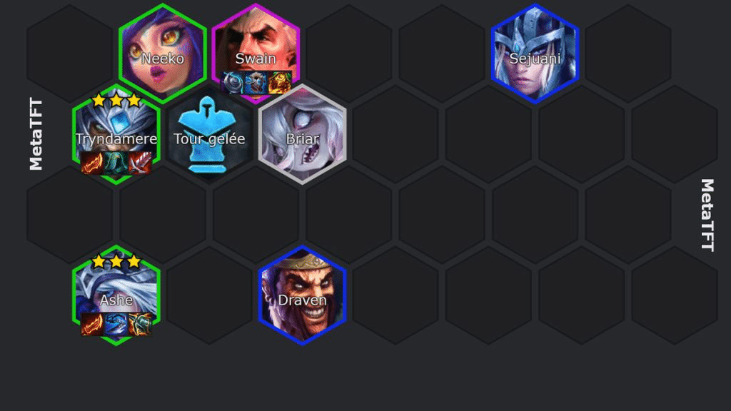 La compo Ashe Tryndamere Reroll repose sur Ashe et Tryndamere 3 étoiles, avec Sejuani et Neeko pour compléter les traits Freljord et Défenseur. Slow roll au niveau 6 assure le développement des carrys et une montée efficace vers le late game.