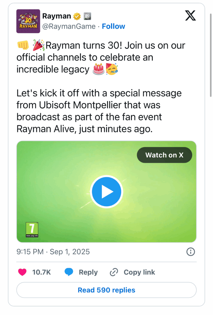 Une nouvelle vidéo a été publiée hier soir sur X (anciennement Twitter), sur le compte Ubisoft dédié à Rayman, à l’occasion des 30 ans de la franchise. Ubisoft semble déterminé à raviver l’intérêt autour de cette série autrefois emblématique.