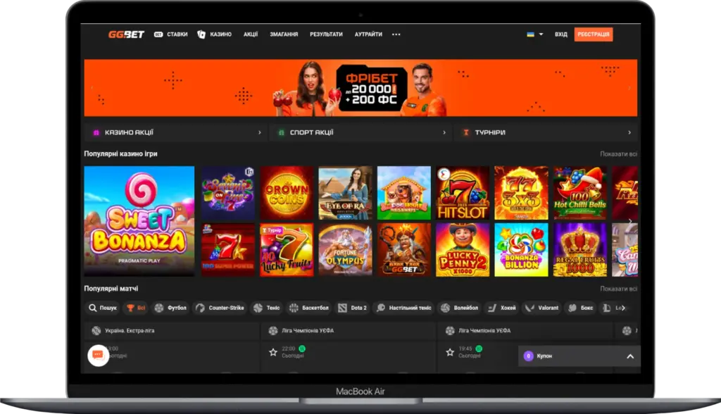 Платформа об’єднує онлайн-казино, спортивні ставки та кіберспорт в одному акаунті без потреби реєстрації окремих профілів. Вітальний бонус 200% діє для нових гравців з вейджером 40x на бонус та 35x на безкоштовні обертання. Каталог включає ігри від Pragmatic Play, Amatic, Playson, BGaming, Novomatic, Microgaming, NetEnt та інших топових постачальників.