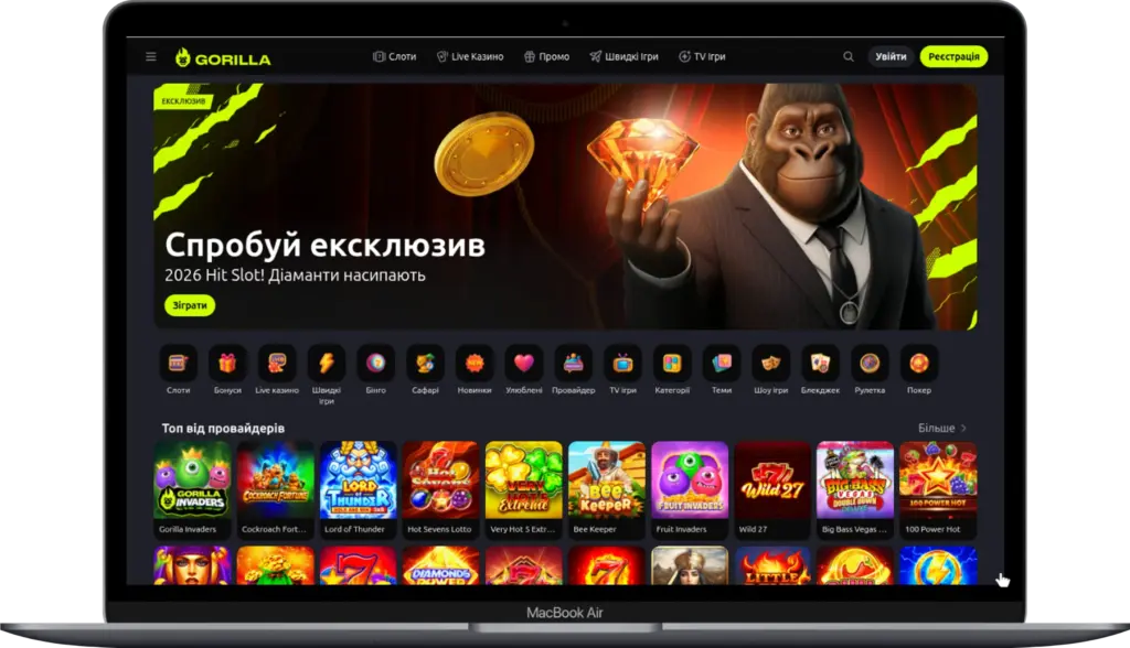 | Gorillabet | ⭐⭐⭐⭐☆ | Найбільший вітальний пакет 570% до 500 000 UAH для нових гравців | 570% до 500 000 UAH + 300 фріспінів |