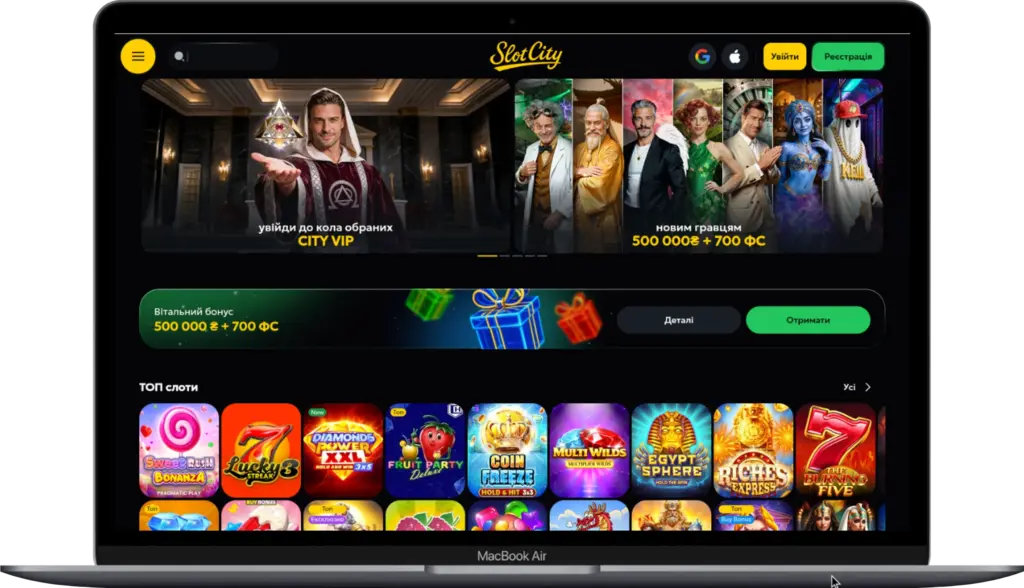 | Slotcity | ⭐⭐⭐⭐⭐ | Бібліотека 6000+ ігор з live-столами та українськими дилерами | До 200 000 грн + 500 фріспінів |