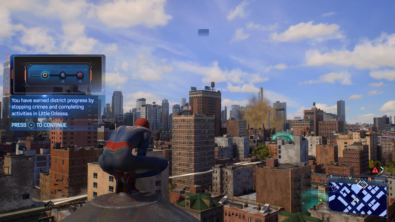 It’s a cliché to describe a piece of multimedia’s setting as “a character” or “a star”, and that is particularly true of a setting as familiar as New York City. However, Spider-Man 2 is designed in such a way as to make the player aware of their relationship to the urban space. It does this in a number of ways. Some of these are familiar game mechanics, with fetch quests for loot crates or bots encouraging the audience to think about the city’s layout and how they interact with it.
