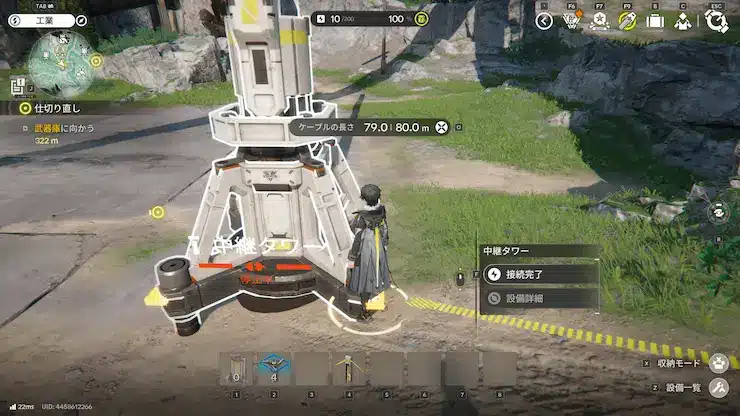 この中継タワーは電力供給源、あるいは中継タワー間をケーブルを使ってコネクションしていくことで電力の供給ラインが完成する。ケーブルを敷設するモードに移行すると、プレイヤーキャラクターが歩いた距離分だけケーブルが追従して伸びていく。そしてケーブルの距離限界が「80m」という距離なのである。