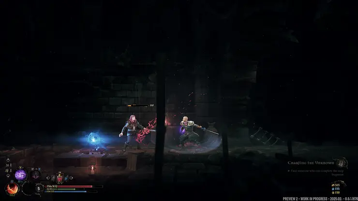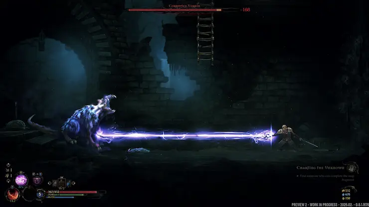 戦闘には、どんな展開になるか分かっているつもりでも、独特のリズムがある。視点の都合上、容赦なくハイペースなメトロイドヴァニアではないが、一般的なソウルライクゲームほど戦術的で柔軟性があるわけでもない。敵の動き(と数)を読み、賢く行動することが重要だが、敵があまり長く隙を待つようなことはまずない。与えられたスペースを最大限に活用することが非常に重要のようだ。だからこそ、私はそれほど高価ではないマナポーションを飲みながら、魔法のビームで小型の悪者や呪われた生き物を吹き飛ばすのに、全く抵抗がなかった。