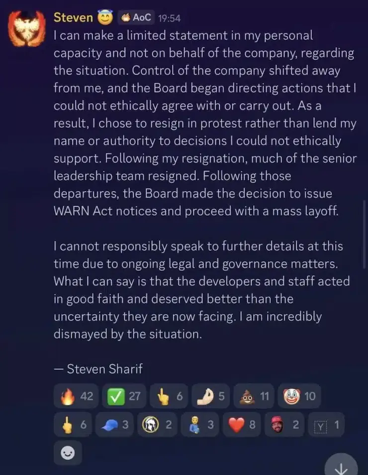 これに続き、Intrepid StudiosのCEO兼創設者であるスティーブン・シャリフ氏からDiscordメッセージが届き、スタジオの閉鎖が事実上確定した。シャリフ氏は、「会社の経営権」が自分から離れ、取締役会は自分が「倫理的に同意できない」決定を下していると述べた。
