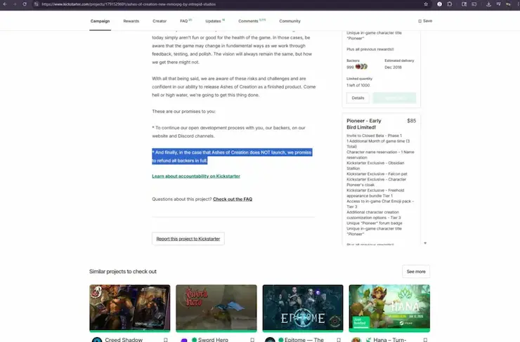 Ashes of Creationのクラウドファンディング参加者は、閉鎖後に資金が返ってくるかどうか疑問に思っている