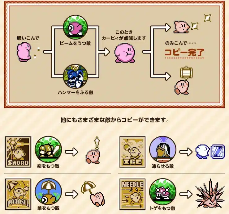 そこから少し飛んでスーパーマリオブラザーズ3の時代になると、キャラクターを表すドット絵のサイズが大型化。それに伴い、キャラクターの造形がより分かりやすく表される様になっていく。ファミリーコンピュータ後期の作品である「星のカービィ 夢の泉の物語」の時代では更に進んで、キャラクターのドット絵に陰影が使われる事が増えてくるようになる。こうなるとキャラクターの丸みや立体感をぐっと表せる様になり、ドット絵が「切り絵のような一枚絵が動いている」という状況から、よりビジュアルを明確にしたものへと質を上げていったのである。