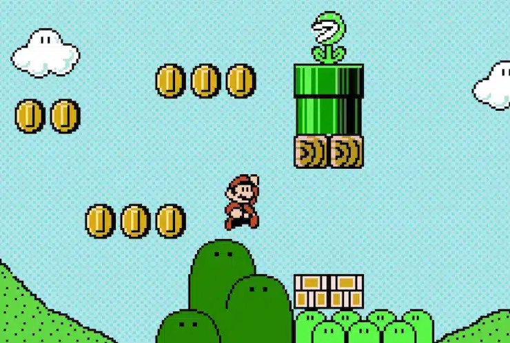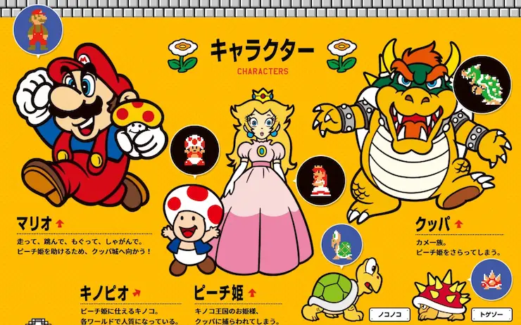 分かりやすい事例としてファミリーコンピュータを挙げるが、誰もが知っているであろう「スーパーマリオブラザーズ」において、マリオなどのキャラクターを表すドット絵を中心に見ていく。画像を見ても分かる通り、キャラクターを表す上でドットの色使いが明確にメリハリの効いた色合いとして表れている。
