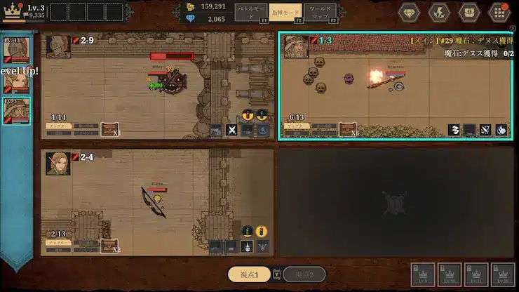 そしてまたしばらく進むと、2人目のキャラクターと「指揮モード」が解放される。これがこのゲームの最も特徴的な要素だ。2人目のエルフのアーチャーをアンロックすると、指揮モードで1人目のナイト、2人目のアーチャーの様子を「リアルタイムで」見ることが出来るようになる。これでゲームの下地がほぼ出揃った事になる。つまり普段は指揮モードを眺めつつ、時にステージを周回させたり所持アイテムを売り払ったりするという介入が必要になるシステムなのである。なお今後、2人同時出撃可能となるパーティーダンジョンコンテンツも実装予定との事だ。