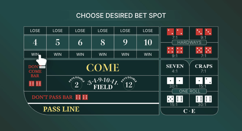 - Mỗi lượt chơi Craps mới bắt đầu, người chơi sẽ chọn một chỗ ngồi ảo