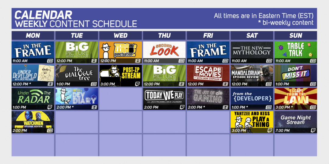 Escapist brings you high-quality recurring editorial and videos every week. All times noted below are in Eastern Standard (EST)